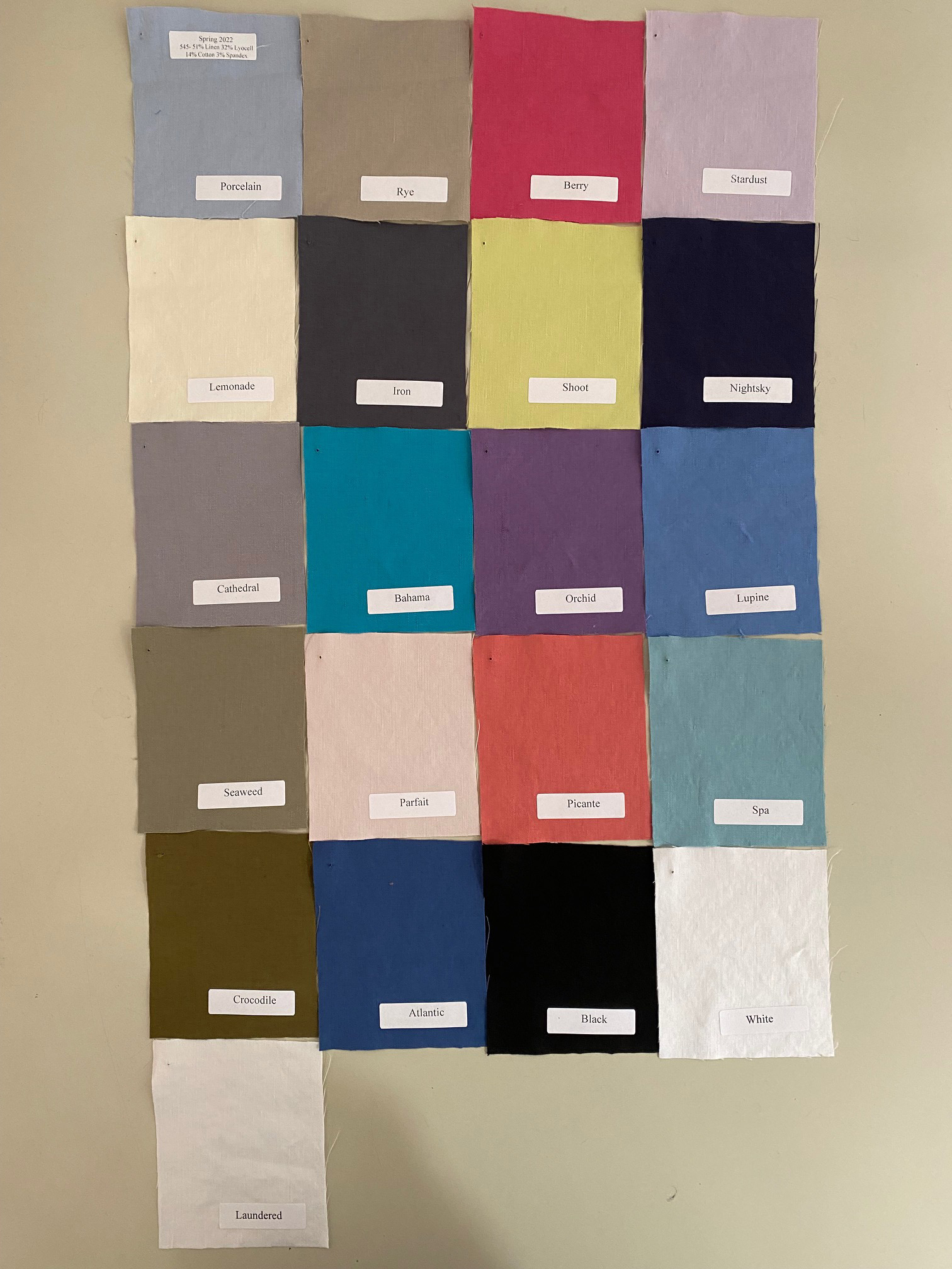 | Colors | Atlantic, Bahama, Berry, Crocodile, Lemonade, Lupine, Nightsky, Orchid, Parfait, Picante, Porcelain, Shoot, Spa, Stardust, Rye, Iron, Seaweed, Cathedral, Black, White, Laundered |